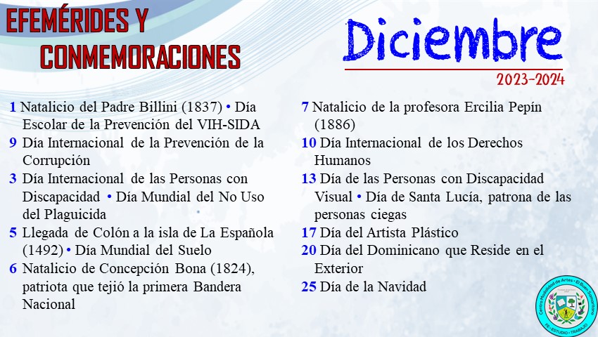 Aquellos acontecimientos notables que son recordados y conmemorados en nuestro país, fechas establecidas a través del tiempo para conmemorar valores, buenos hábitos y acontecimientos que han marcado un antes y un después en la vida de todo dominicano, y que permiten sensibilizar y concientizar a la población sobre ellos.